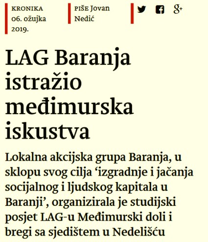 O tom studijskom putovanju objavljen je članak pod naslovom "LAG Baranja istražio međimurska iskustva" u zagrebačkim "Novostima" broj 1003 (8. III. 2019, str. 4do) te na portalu "Novosti" dva dana prije (vidjeti ovdje). Putnici su posjetili: Mlin na Muri u mjestu Žabnik, Etnozbirku i OPG Stanko Trstenjak u mjestu Marof, Voćnjak starih sorti jabuka u mjestu Brezovec, Izletište Vinska kuća Hažić u mjestu Jurovčak, Izletište i restoran Međimurski dvori u mjestu Lopatinec i LifeClass Terme Sveti Martin u Svetom Martinu na Muri.